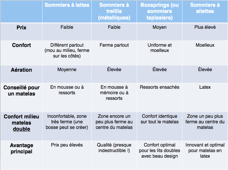 Pour vous aider, voici un petit récapitulatif des différents types de sommiers et de leurs caractéristiques :-)